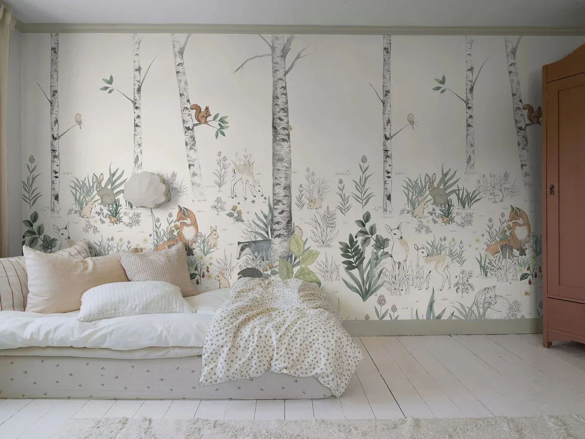 Filled with the most adorable selection of woodland animals, Borastapeter Magic Forest Mural depicts an enchanted world populated by floppy-eared rabbits and white-spotted fawns. Designed in collaboration with Newbie, it brings the wonders of the outdoors into your home interior. Create a beautiful space for children to grow and learn in. The pattern is repeatable in breadth, (W) 270cm x (H) 265cm and is divided into six 45 cm wide wallpaper panels.