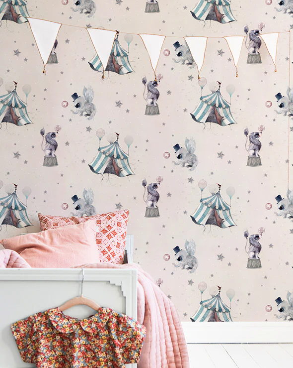 This circus themed wallpaper shows a world full of epic experiences, unparalleled magic and dreamlike backdrops. Meet the elephant with bumps on his back that turned into magical wings or the little lion that grew a magnificent and flowing mane, with lots of shiny golden hair that billowed in the wind. And what is the story of the flying carnival? Surely nobody lives in a flying tent in the clouds, well at least that’s what people think because at night, the tent sparkles and shines and sometimes it seems as though the sky and the tent are speaking their very own language.